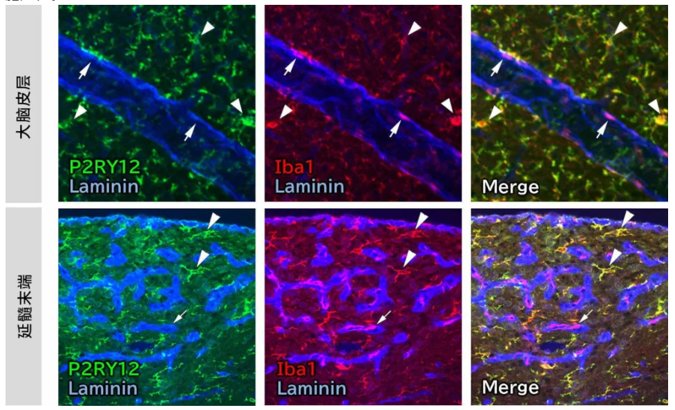 P2RY12(也稱為P2Y12)是一種腺苷5'-二磷酸(ADP)受體,也是嘌呤能G蛋白偶聯(lián)受體P2Y家族的成員。它在外周組織的血小板中表達(dá),也在中樞神經(jīng)系統(tǒng)的穩(wěn)態(tài)小膠質(zhì)細(xì)胞(Homeostatic Microglia)中特異性表達(dá)。由于P2RY12幾乎不在巨噬細(xì)胞中表達(dá),所以它是用于區(qū)分存在腦血管周圍的巨噬細(xì)胞和小膠質(zhì)細(xì)胞的有效標(biāo)志物1)。此外,ADP可用作細(xì)胞損傷的信號(hào),小膠質(zhì)細(xì)胞中的P2RY12被認(rèn)為在接收神經(jīng)細(xì)胞損傷方面發(fā)揮作用。