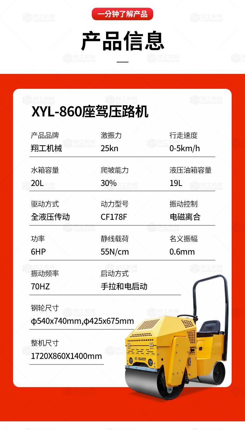XYL-860座駕壓路機(jī)適用于各種溝槽沙土回填壓實(shí)、高層建筑地下室土方壓實(shí)、小區(qū)道路基礎(chǔ)壓實(shí)、各種草坪壓實(shí)、修補(bǔ)及各種小型工程的使用,解決了大型壓路機(jī)無法工作區(qū)域的壓實(shí)作業(yè)。