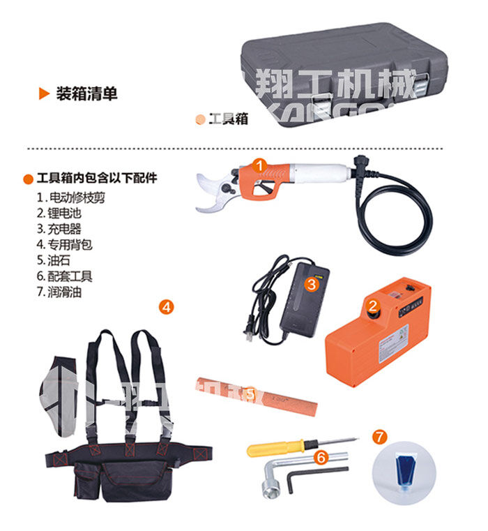 本產(chǎn)品為電池驅(qū)動(dòng)電動(dòng)修枝剪,由固定刀片、移動(dòng)刀片、鋰電池、充電器、連接線、工作包、工具箱等部分組成,充電電壓為AC 110V~240V,主要應(yīng)用于30mm以下果枝嫁接的剪切和修剪及大批果園修剪、收摘等。使用時(shí)簡(jiǎn)捷方便,是傳統(tǒng)手工剪枝效率的8-10倍,修枝質(zhì)量明顯高于傳統(tǒng)手工剪刀。