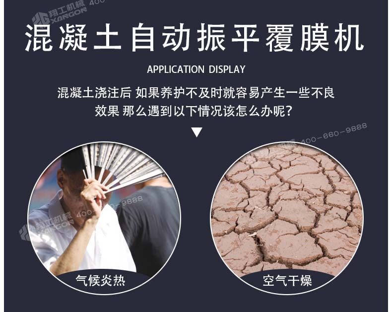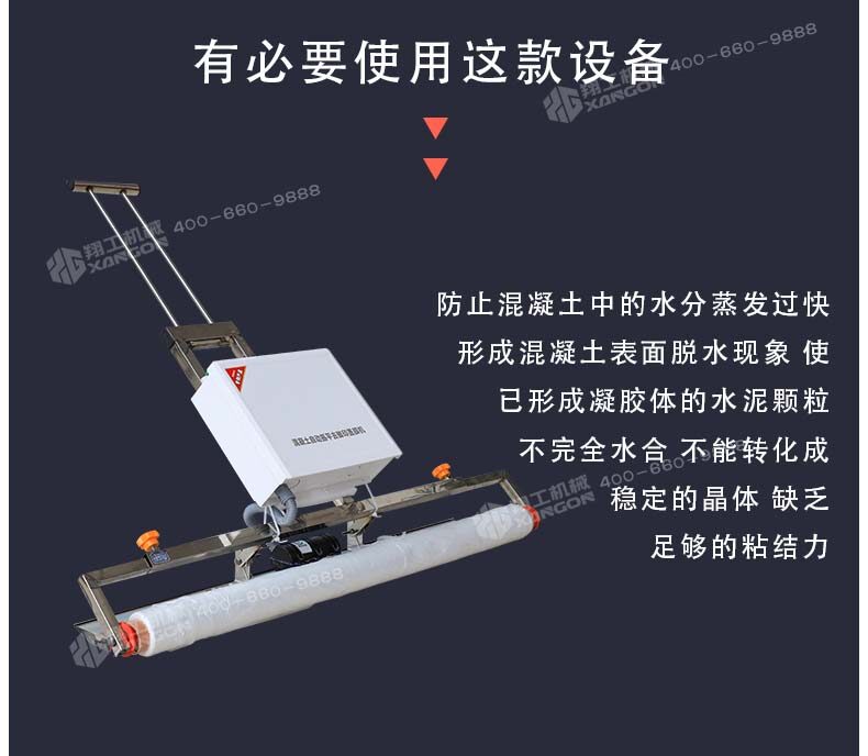 混凝土澆注后,如果養(yǎng)護(hù)不及時就容易產(chǎn)生一些不良效果,如氣候炎熱、空氣干燥等情況,我們就有必要使用這款設(shè)備,防止混凝土中的水分蒸發(fā)過快,形成混凝土表面脫水現(xiàn)象,使已形成凝膠體的水泥顆粒不完全水合,不能轉(zhuǎn)化成穩(wěn)定的晶體,缺乏足夠的粘結(jié)力。因此,混凝土表面會出現(xiàn)剝落或粉粒脫落。另外,當(dāng)混凝土強(qiáng)度不夠時,過早蒸發(fā)水分會產(chǎn)生較大的收縮變形和干縮裂縫。因此,混凝土澆筑后的初期養(yǎng)護(hù)非常重要,終凝后應(yīng)立即進(jìn)行養(yǎng)護(hù)。