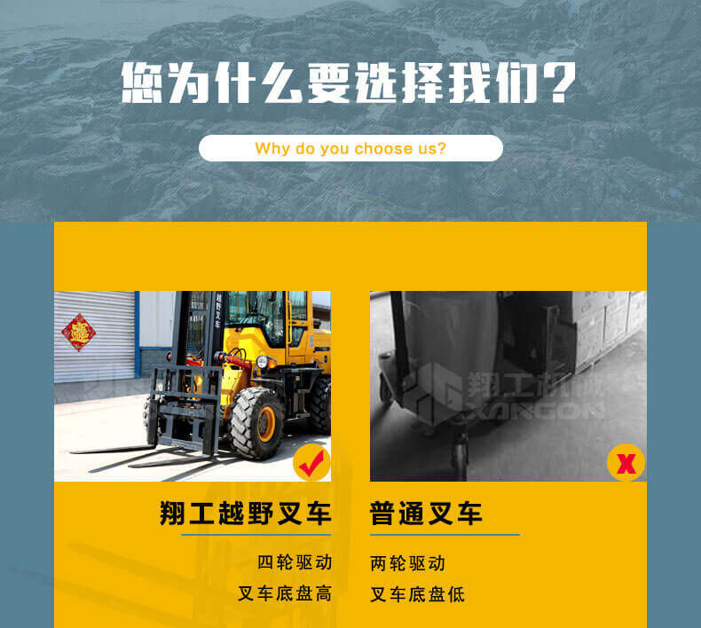 3.普通叉車(chē)只能在平整的路面上作業(yè),而越野叉車(chē)既可以在普通路面上作業(yè),還可以在山路泥路崎嶇道路作業(yè),輪胎抓地力強(qiáng),不打滑。