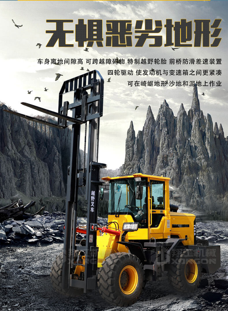 越野叉車(chē)可以在坡地和不平地面上進(jìn)行貨物裝、卸、堆垛及搬運(yùn)作業(yè),具有良好的機(jī)動(dòng)性、越野性可靠性。其功能多樣,可搭配側(cè)移器、調(diào)距叉、旋轉(zhuǎn)器、軟包夾、推出器、側(cè)翻叉、側(cè)翻斗、起重臂等工具完成不同的工作。