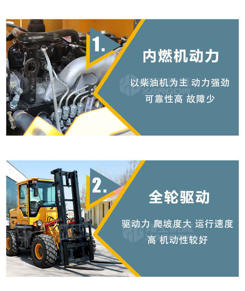 5.越野叉車(chē)發(fā)動(dòng)機(jī)功率大,采用全輪驅(qū)動(dòng)和越野輪胎。