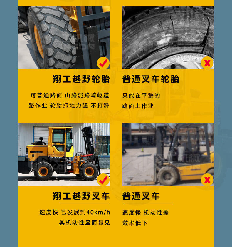 3.普通叉車只能在平整的路面上作業(yè),而越野叉車既可以在普通路面上作業(yè),還可以在山路泥路崎嶇道路作業(yè),輪胎抓地力強(qiáng),不打滑。