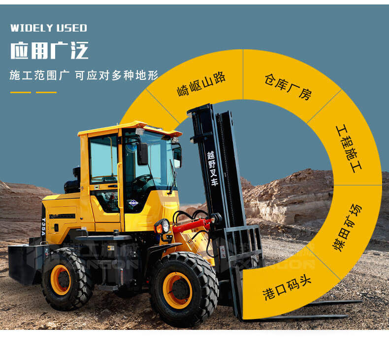 越野叉車適用于道路修筑、城市建設(shè)、環(huán)境衛(wèi)生、石料場、中小型土木工程、車站、碼頭、貨場、倉庫等地方,主要用來轉(zhuǎn)運(yùn)石料、設(shè)備、貨物、城市垃圾箱以及集裝物料等。