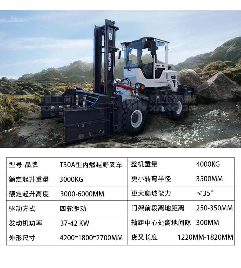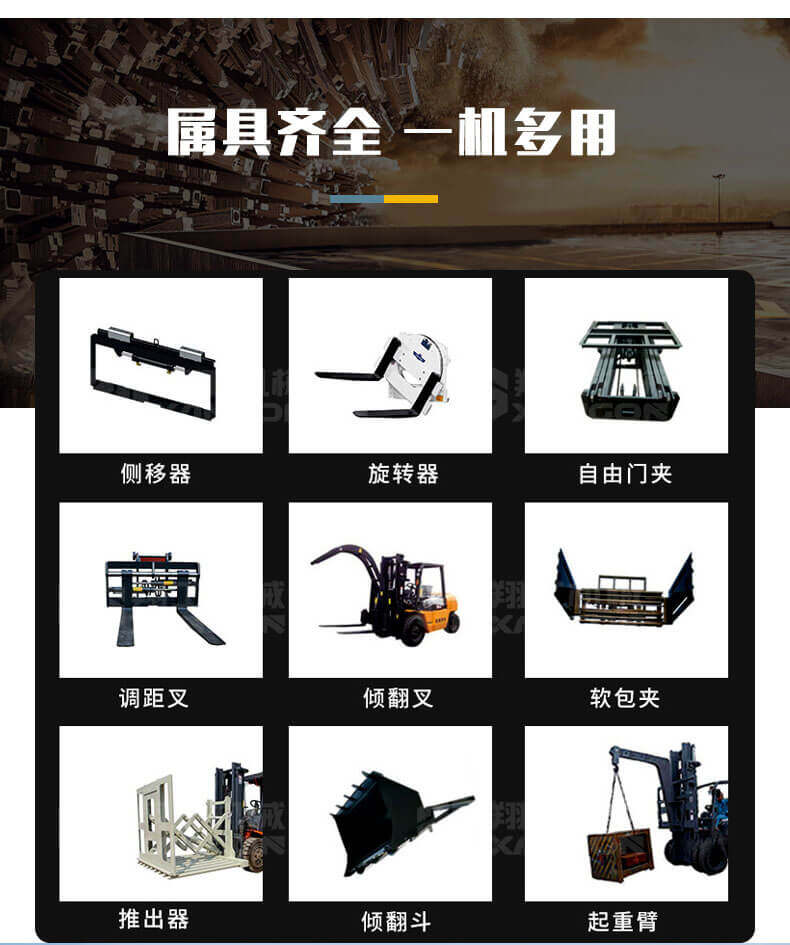 多功能越野叉車可以在坡地和不平地面上進(jìn)行貨物裝、卸、堆垛及搬運(yùn)作業(yè),具有良好的機(jī)動性、越野性可靠性。其功能多樣,可搭配側(cè)移器、調(diào)距叉、旋轉(zhuǎn)器、軟包夾、推出器、側(cè)翻叉、側(cè)翻斗、起重臂等工具完成不同的工作。
