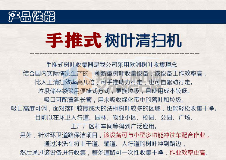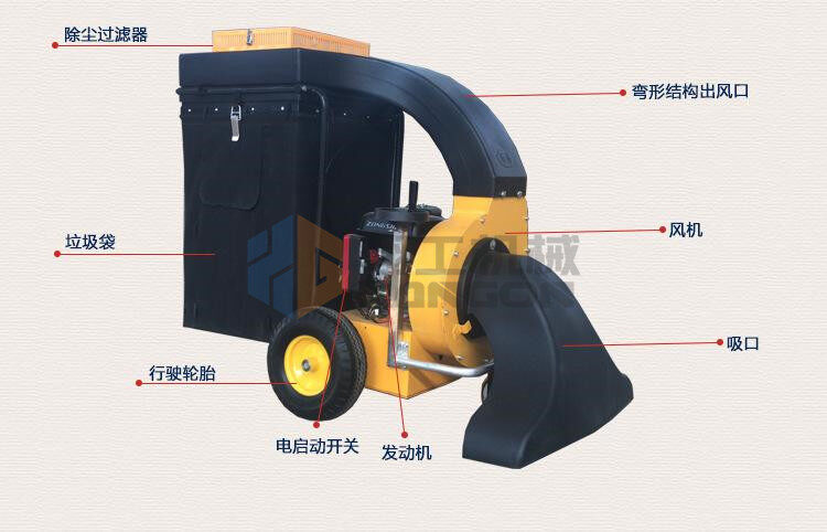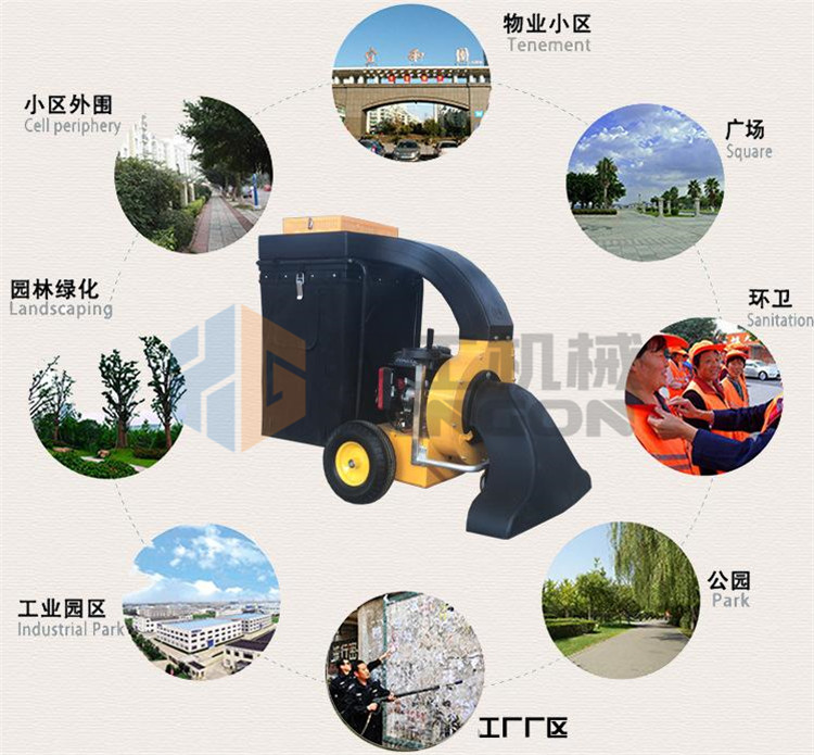 該設(shè)備工作效率高,比人工清掃效率高幾倍,可手推助力行走。垃圾儲(chǔ)存袋采用便捷式方式,便于更換垃圾,且使用成本較低。吸口可配置延長管,用來吸收綠化帶中的落葉和垃圾。吸口高度可調(diào),面對(duì)落葉較厚或大的法桐樹葉較多的區(qū)域,也能輕松收集干凈。目前以用在環(huán)衛(wèi)人行道、園林、物業(yè)小區(qū)、校園、公園、廣場(chǎng)、工廠廠區(qū)和車間等得到廣泛應(yīng)用。