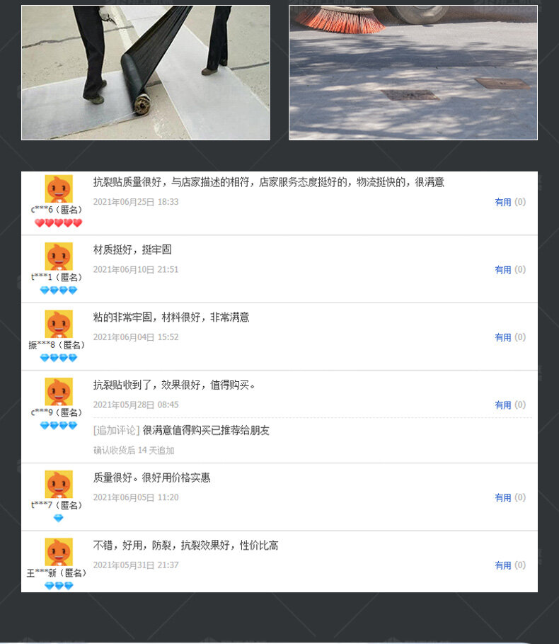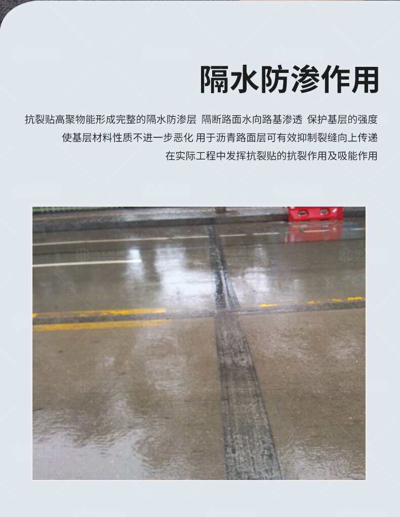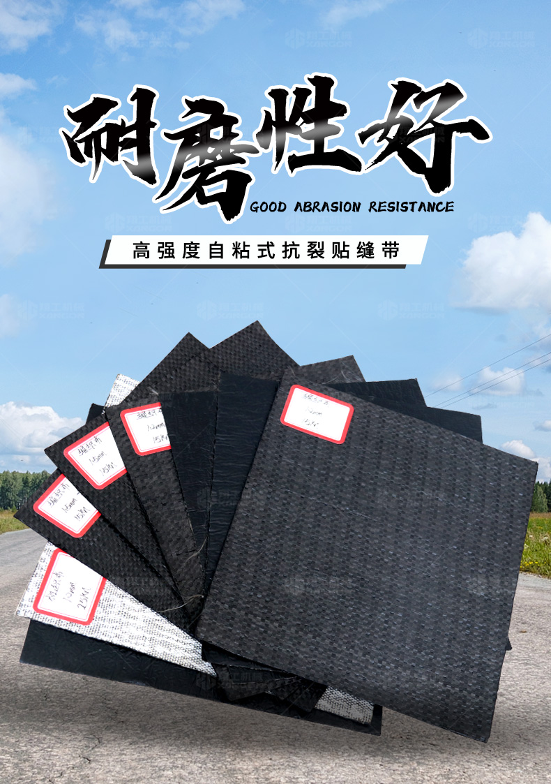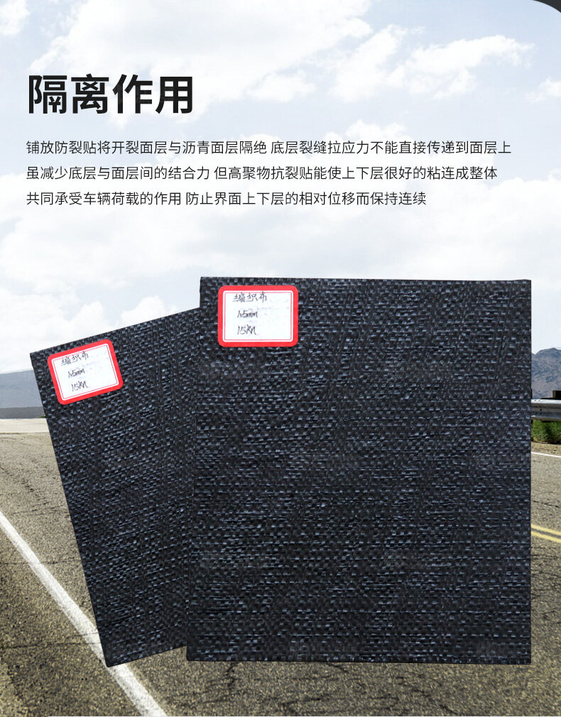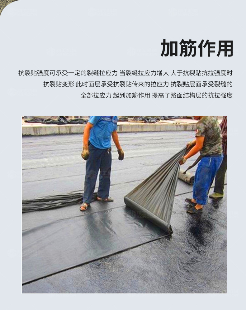 防裂貼(又稱抗裂貼)是由瀝青基的高分子聚合物、抗拉胎基、耐高溫并與瀝青相容的織物復(fù)合而成。將其貼于產(chǎn)生裂縫或剝落的瀝青混泥土面,能減少并阻隔其作用于路面的溫縮應(yīng)力,因此也減少了裂縫反射穿過面層的趨勢(shì),鋪設(shè)與路面因其將基層與上部磨耗層隔離開來,從而使上面層免受多向位移及剪切應(yīng)力的影響,用于公路、橋梁、機(jī)場(chǎng)等。