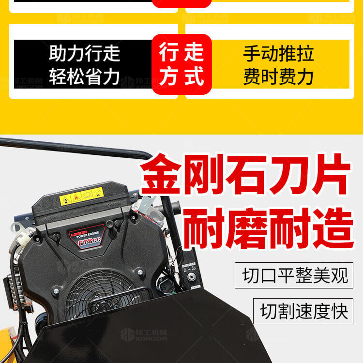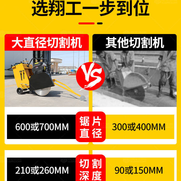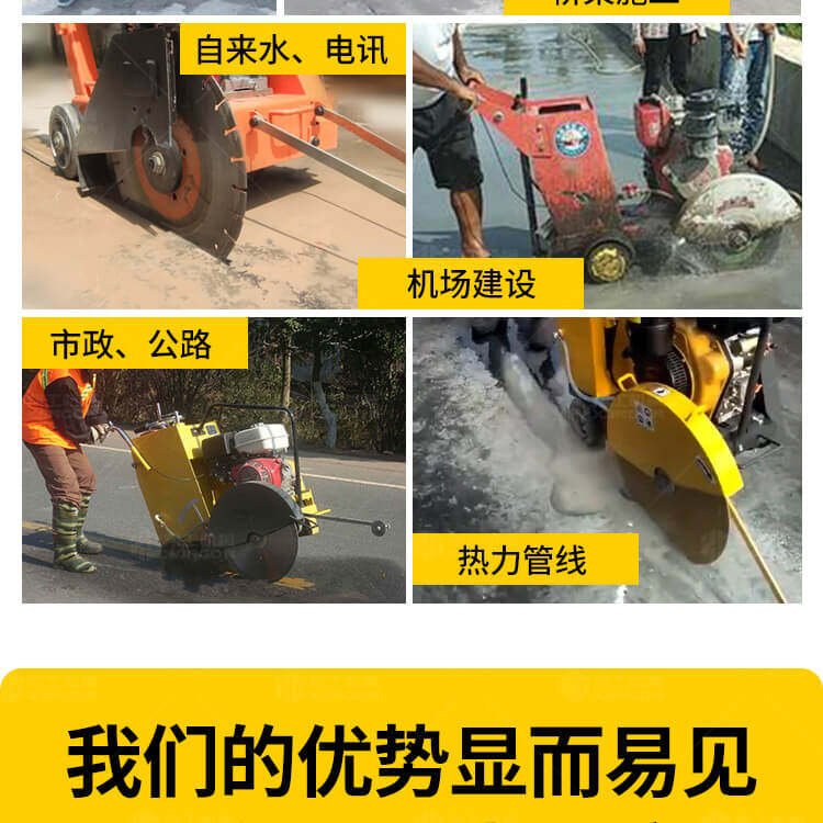 大鋸片大直經(jīng)馬路切割機(jī)自帶水源,降塵降溫,刀片使用壽命長(zhǎng)。